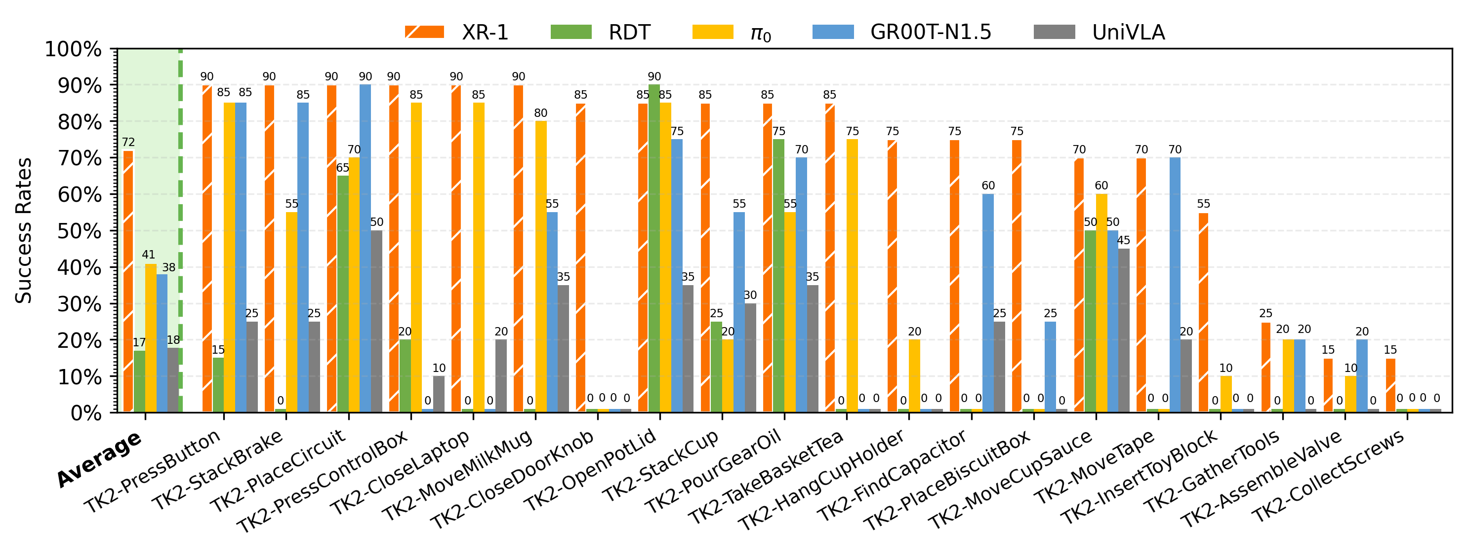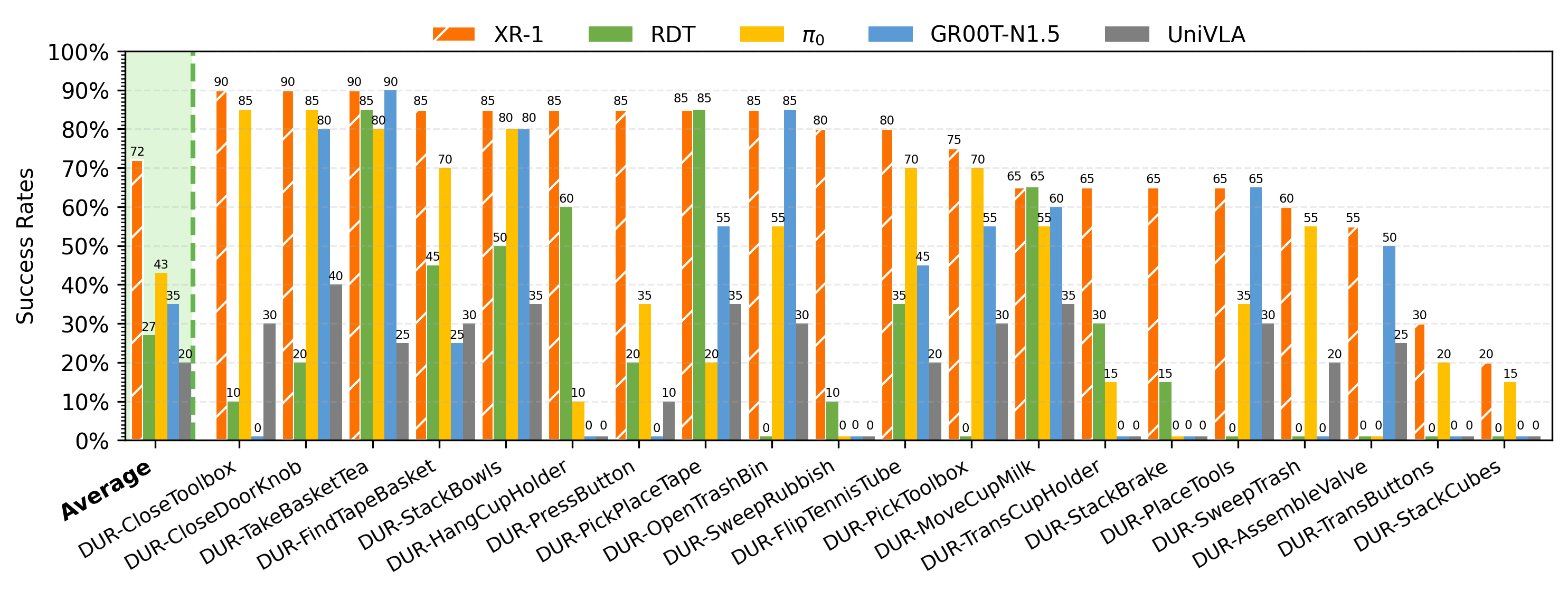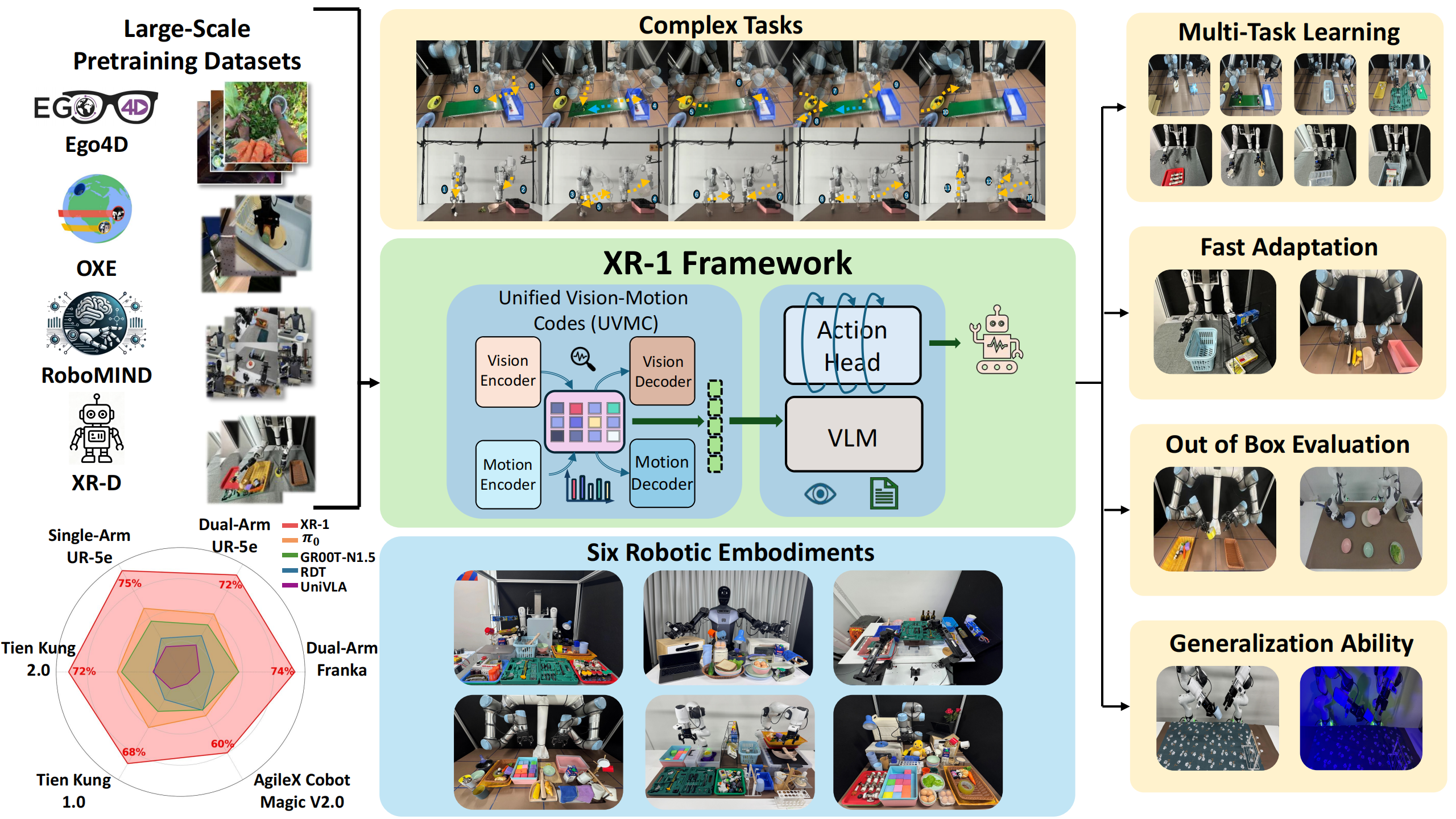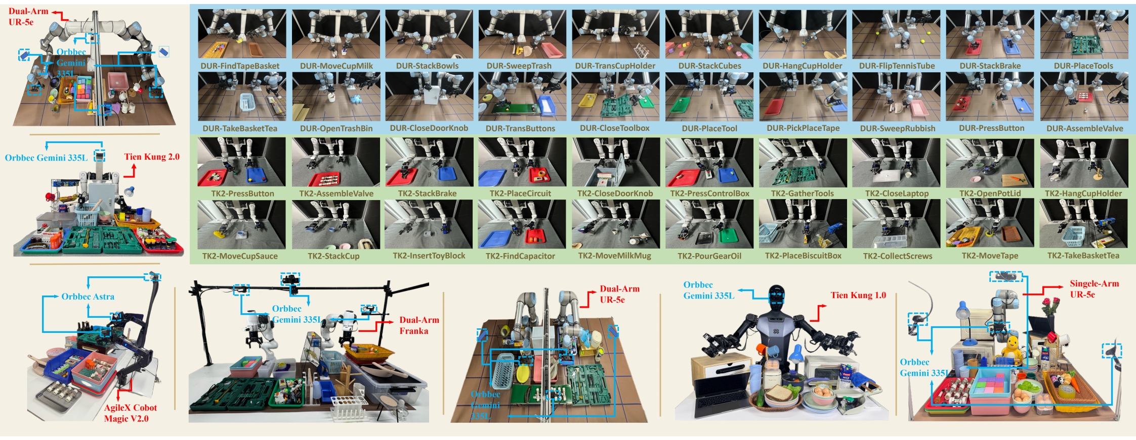 Experimental Setup. We evaluate XR-1 across six robot embodiments(Tien Kung 1.0/2.0, Single-/Dual-Arm UR-5e, Dual-Arm Franka, and AgileX Cobot Magic 2.0), covering more than 120 manipulation tasks with over 120k rollouts.