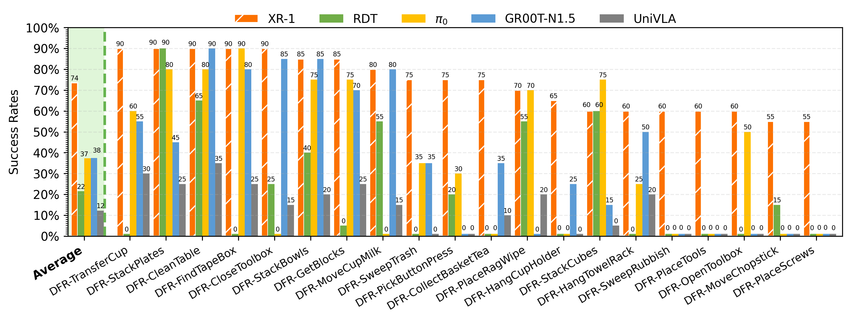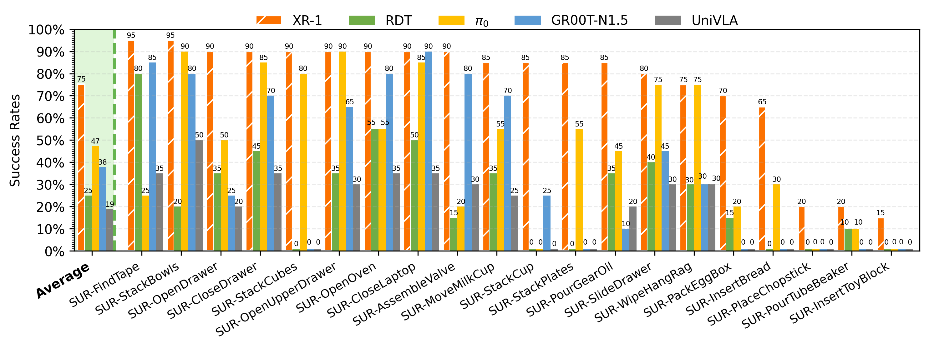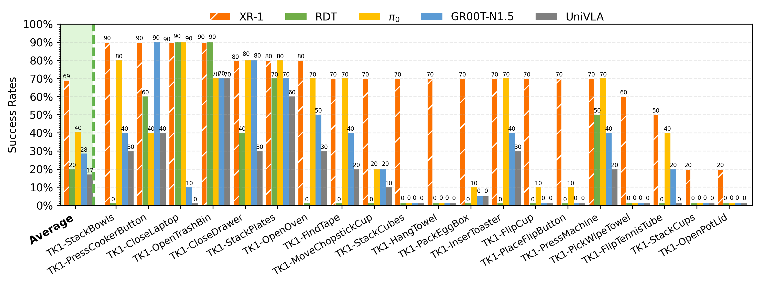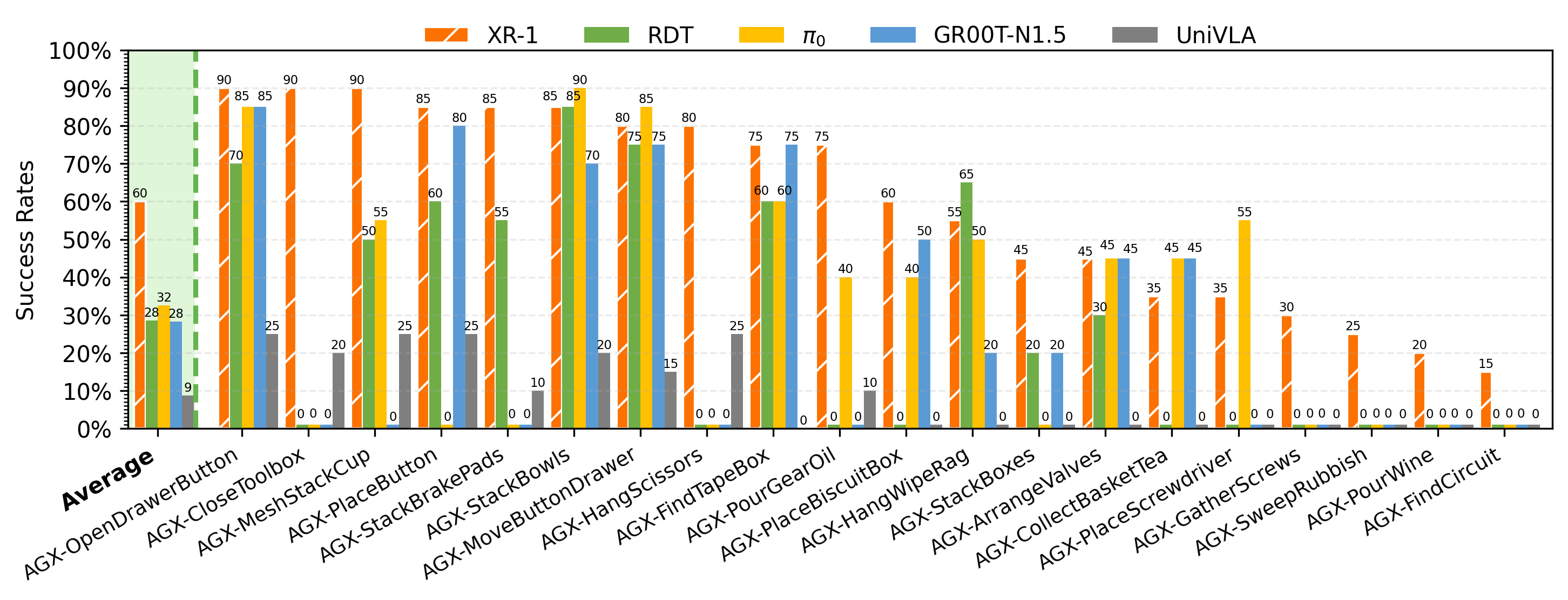 Experimental Setup. We evaluate XR-1 across six robot embodiments(Tien Kung 1.0/2.0, Single-/Dual-Arm UR-5e, Dual-Arm Franka, and AgileX Cobot Magic 2.0), covering more than 120 manipulation tasks with over 120k rollouts.