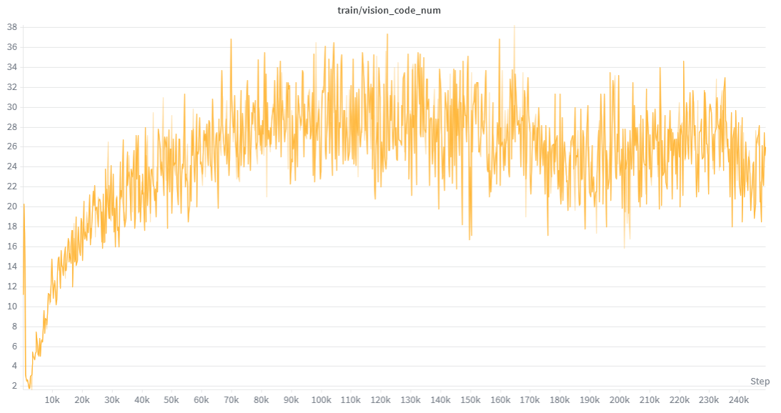 The absence of sudden drops in code usage further confirms that the discrete latent space is consistently utilized to encode complex cross-modal features.
