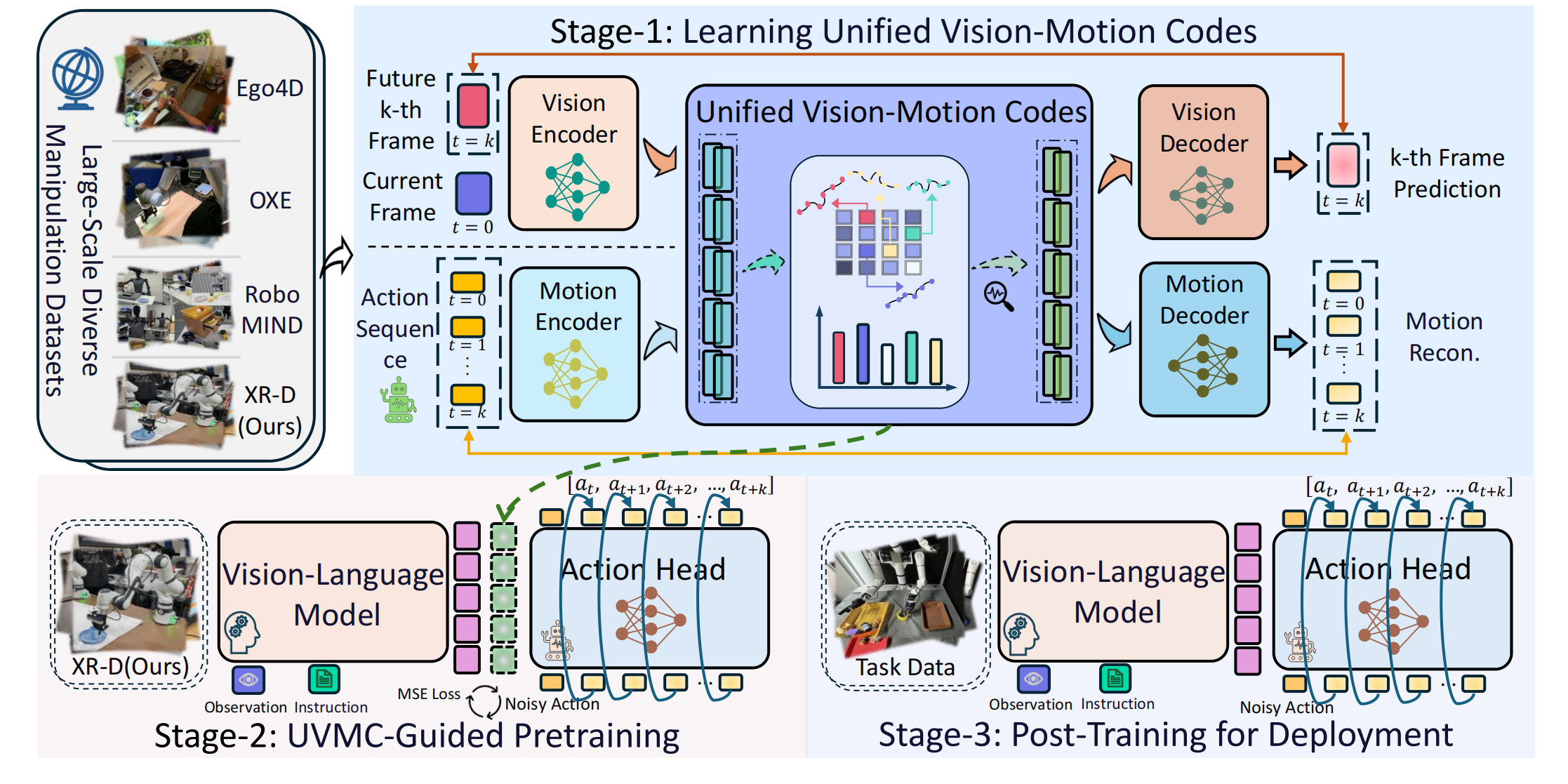 Overview of XR-1. In XR-1, we introduce the Unified Vision-Motion Codes (UVMC), a discrete latent representation that jointly encodes visual dynamics and robotic motion. XR-1 adopts a three-stage training paradigm to enable precise low-level control across diverse robots and tasks.